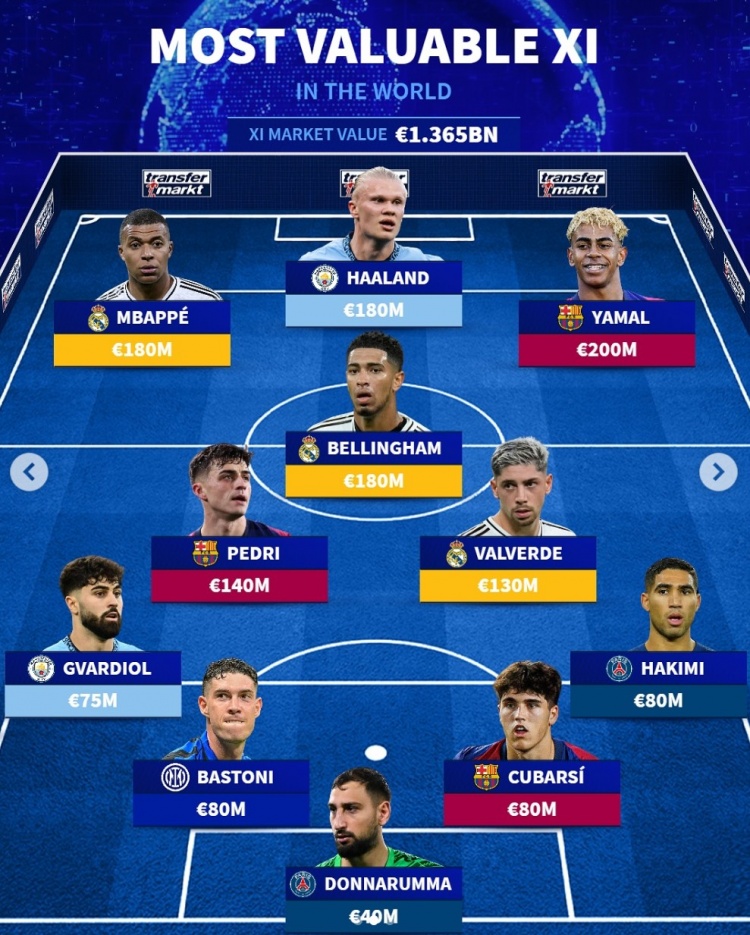 Forwards: Mbappe (Real Madrid/180 million euros), Haaland (Manchester City/180 million euros), Yamal (Barcelona/200 million euros)