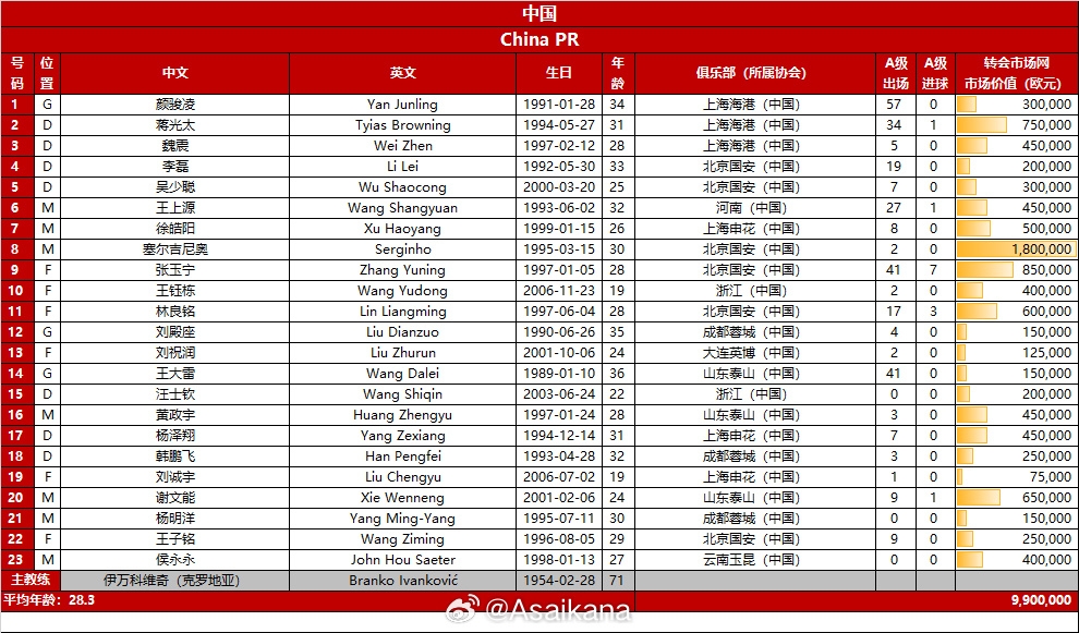 Cao Yongjing and Zhu Chenjie are absent due to injuries. Wang Yudong became China’s new No. 10. Yang Mingyang and Hou Yongyong are expected to make their first appearance in the national football team.