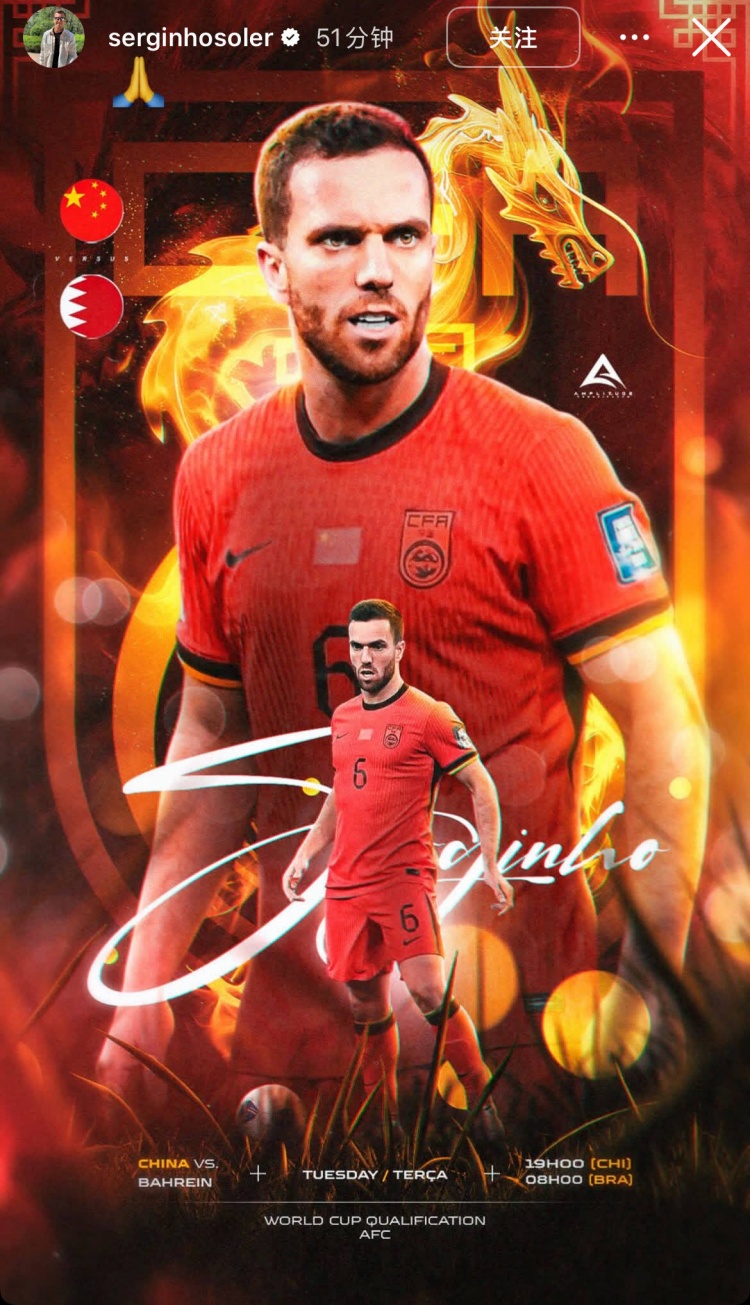 1BSPORTS 1B Sports June 10th Serginho updated his social media this morning and posted his personal poster of the Chinese national football team vs. Bahrain team.