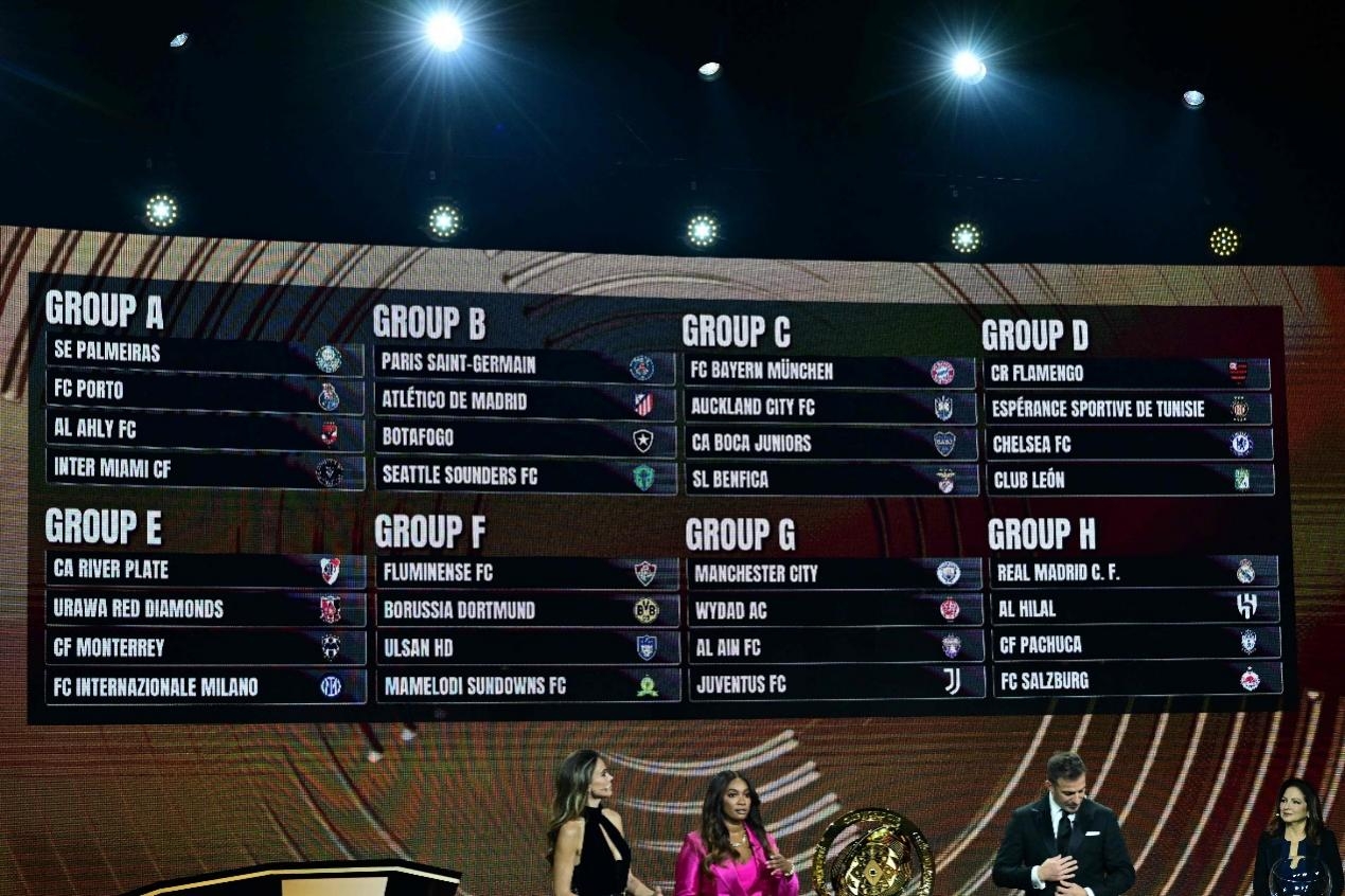 Group E: River Bed , Urawa Red Diamond, Monterrey (Mexico), Inter Milan Group F: Fruminense, Dortmund, Ulsan Hyundai, Mamlodi Sunset (South Africa) Group G: Manchester City, Vidard (Morocco), Abu Dhabi Ain, Juventus Group H: Real Madrid, Riyadh Crescent, Pachuca (Mexico), Salzburg The first new version of the Club World Cup will be held in 12 stadiums in 12 cities in the United States. The group stage will last from June 15 to June 27. In the opening game, Miami International led by Messi faced Cairo Nationals. The game kicked off at 8 a.m. Beijing time on June 15, with the game location at Hard Rock Stadium in Miami.