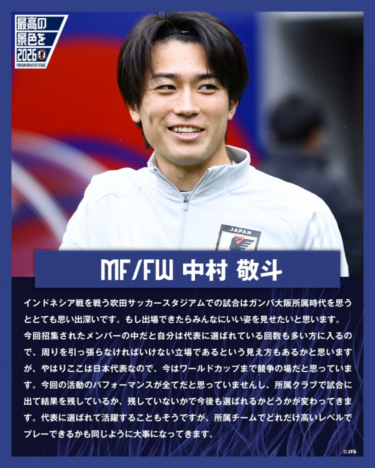 Keito Nakamura said: “The match against the Indonesian team will be played at Suita Stadium (Home Osaka Gamba), which reminds me of my time playing in Osaka Gamba. If I can play in this game, I will show my performance in front of everyone.”