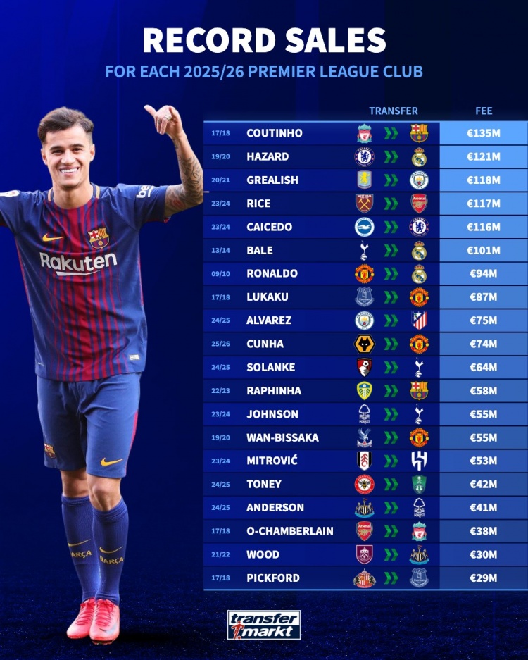 1BSPORTS 1B Sports June 10th The German transfer market has taken stock of the history of the most expensive player sales records of 20 Premier League participating teams in the 2025-26 season, and Coutinho’s 135 million euros are still ranked first.