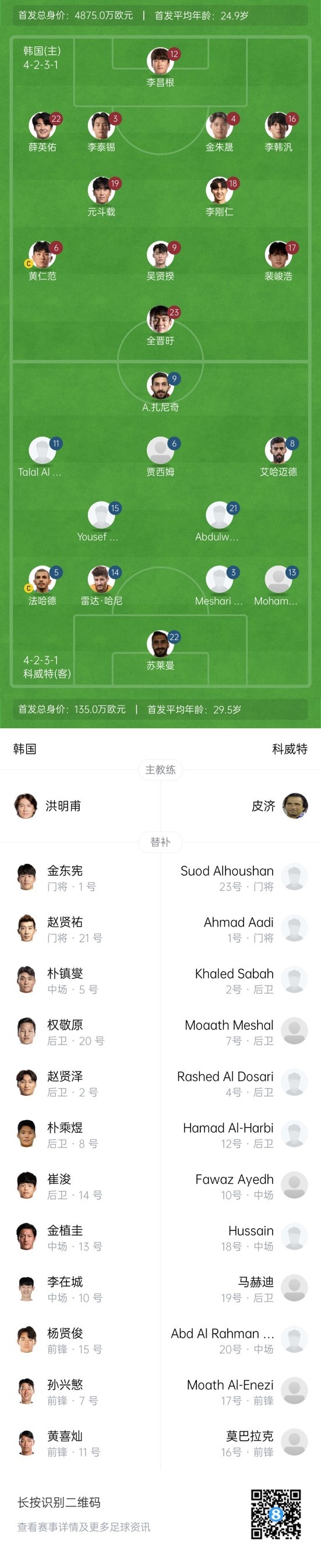 In the 30th minute, South Korea opened the first record! Huang Renfan took a corner kick from the left to the penalty area and Quan Jinqin headed the ball to Hajri and scored, and South Korea 1-0 Kuwait. ↓