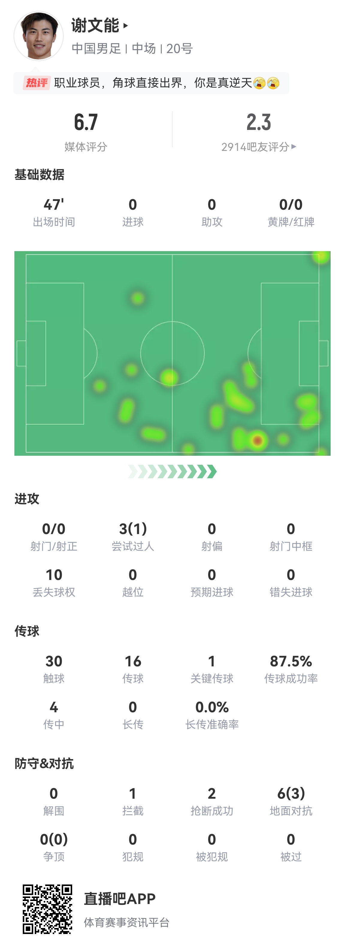 1BSPORTS 1B Sports June 10th Beijing time at 19:00 Beijing time, the 10th round of the third phase of the World Cup Asian qualifiers, the Chinese men’s football team played against Bahrain, and Xie Wenneng’s half-time data was released.