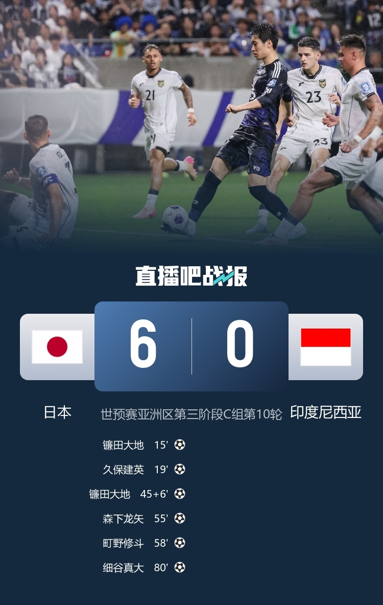 1BSPORTS 1B Sports June 10th Beijing time 18:35, the 10th round of the third phase of the World Cup Asian qualifiers, Japan defeated Indonesia 6-0, with 7 wins, 2 draws and 1 loss and 23 points.