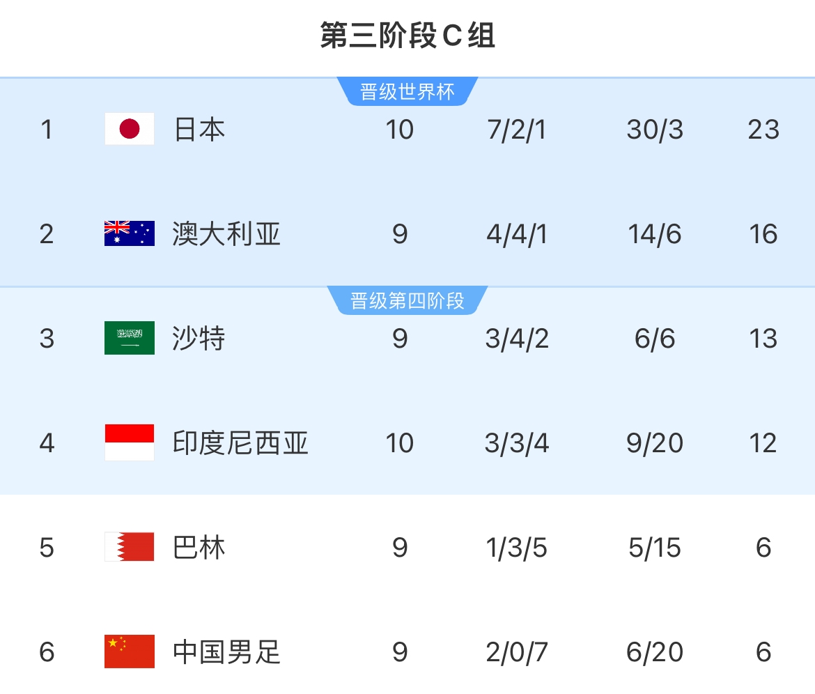 The latest standings for Group C in the third stage of the World Cup qualifiers in Group C are as follows: