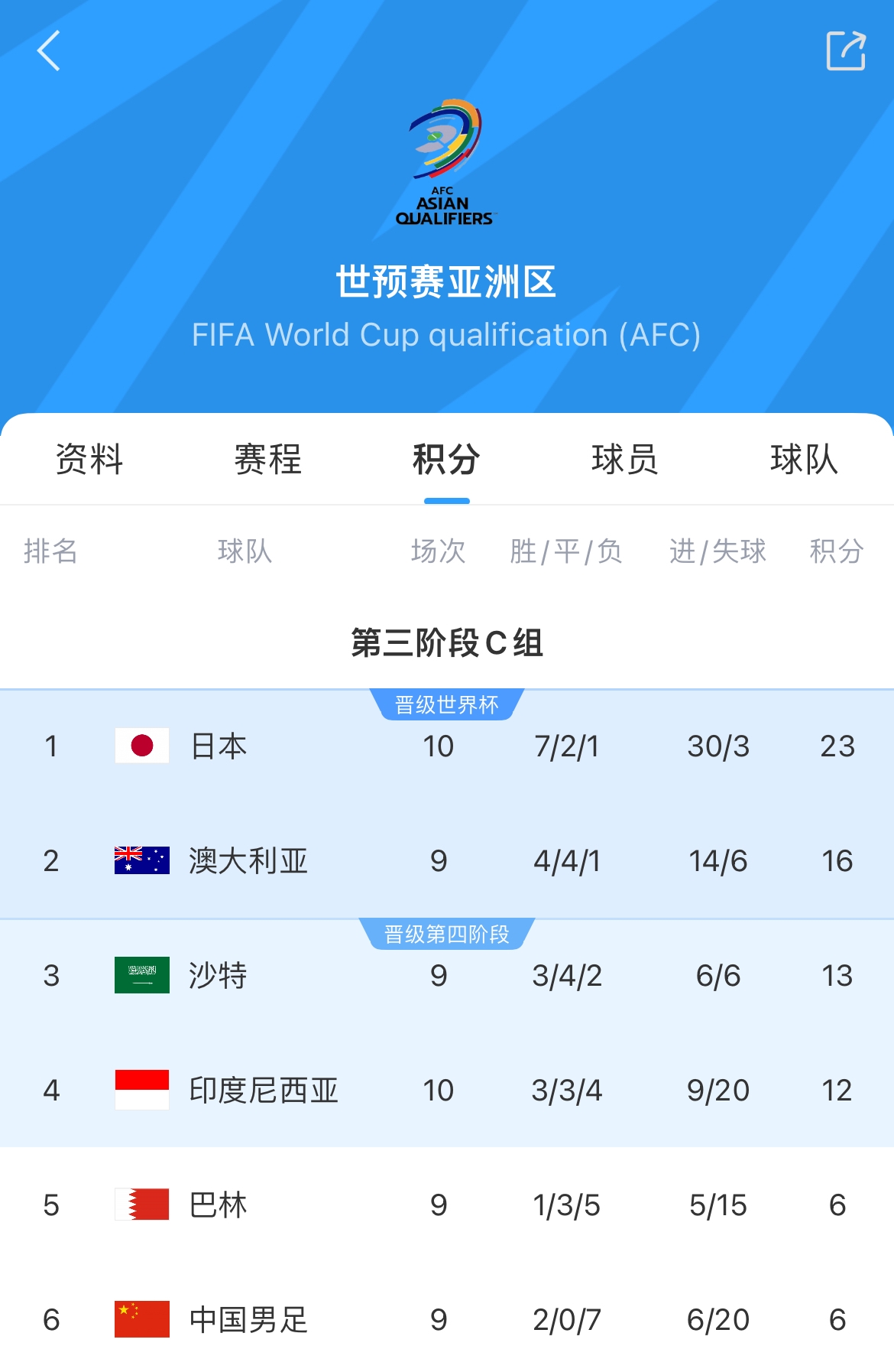 In Group C where the Chinese national football team is located, Japan has advanced to the World Cup. Australia will only lose 5 goals in the last round, and Saudi Arabia will have a direct pass. Saudi Arabia is likely to participate in the playoffs with Indonesia. China and Bahrain were eliminated early.