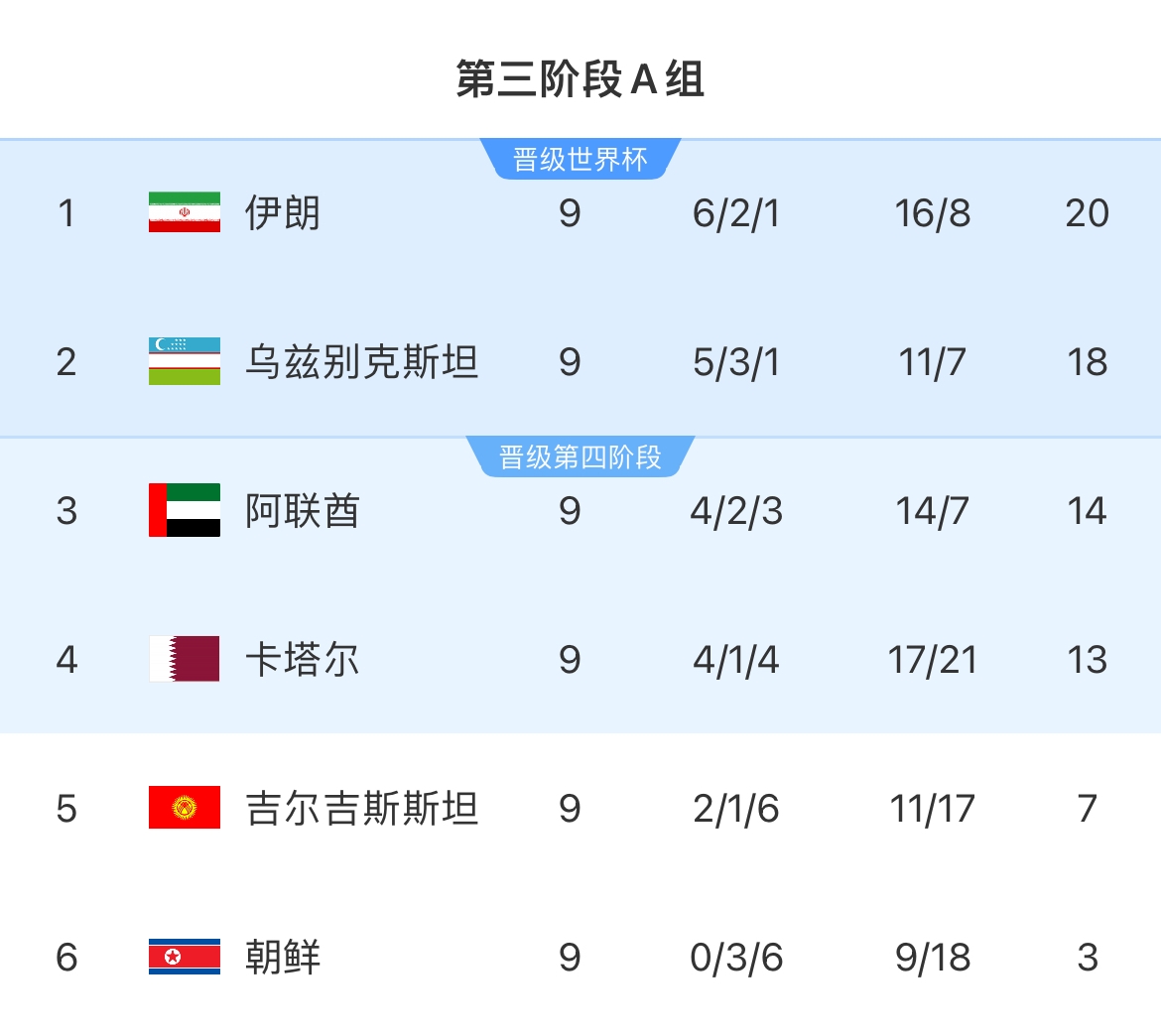In Group A, Iran and Uzbekistan have advanced to the World Cup, the UAE and Qatar have confirmed to participate in the play-offs, and Kyrgyzstan and North Korea have been eliminated.