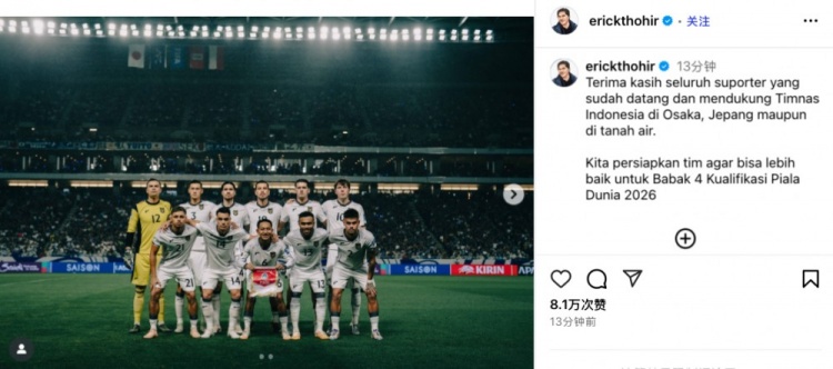 After the game, Indonesian Football Association Chairman Tohill updated his social media, posted a group photo and match photo of the Indonesian team before the start of the game, and wrote: “Thank you all the fans who came to Osaka to support the Indonesian team away, as well as home fans. We are preparing for the play-offs.”