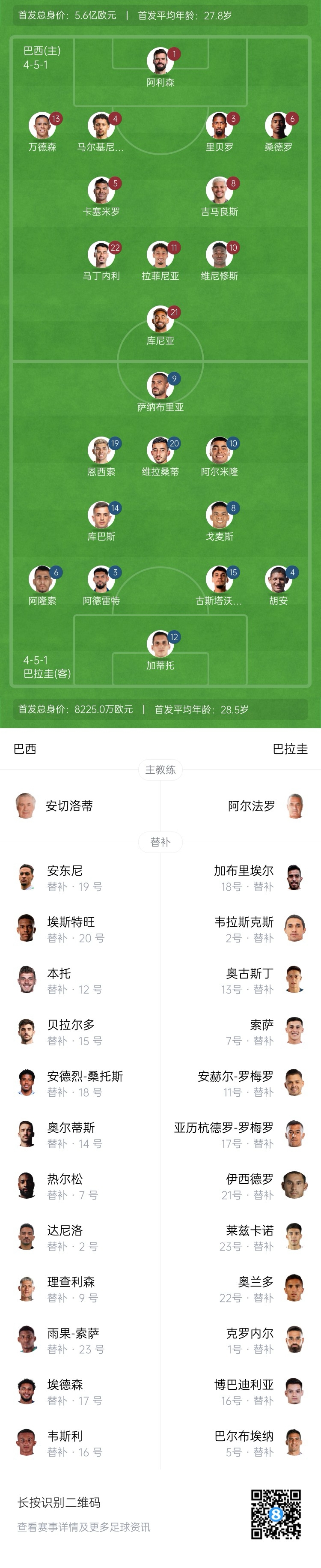 Brazil’s starter: 1-Alisson, 13-Wandersson, 4-Marquinos, 3-Ribero, 6-Sandro, 5-Casemiro, 8-Guimarães, 11-Rafinia, 22-Martinelli, 10-Vinitius, 21-Cunya