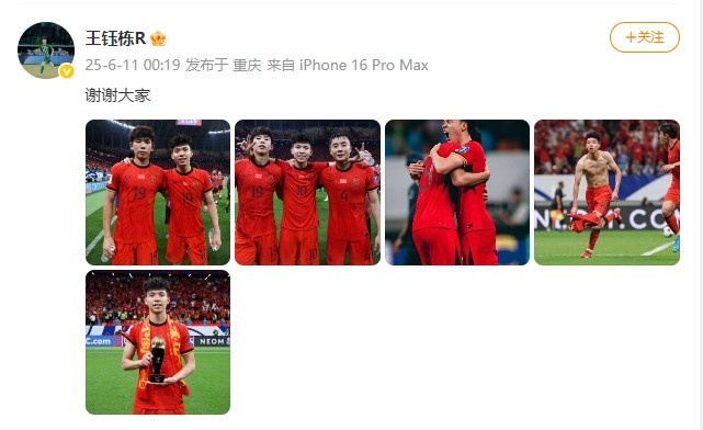 Early this morning, Wang Yudong updated his social media, posted a photo with his teammates, and a photo of his celebrating after he scored, and wrote: “Thank you everyone.”