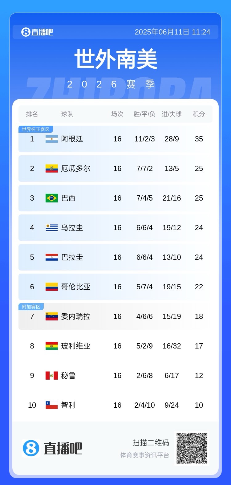 1BSPORTS 1B Sports June 11th The 16th round of the South American World Cup qualifiers has all ended.