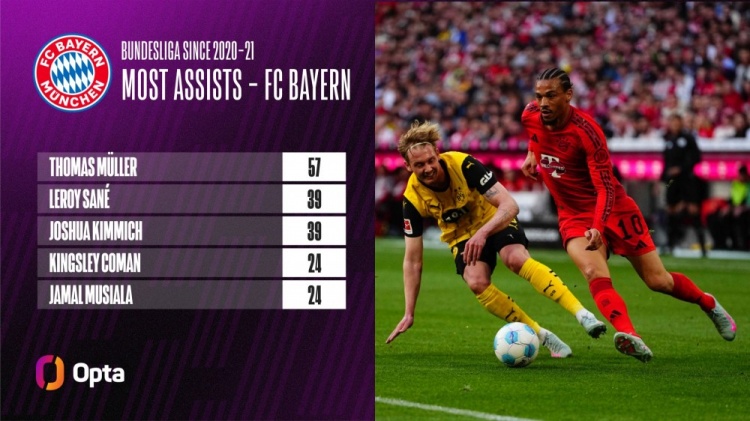 1BSPORTS 1B Sports June 11 According to multiple media reports, Sane refused to renew his contract with Bayern and was close to joining Galatasaray. According to statistics from OptaFranz, since transferring to Bayern in 2020, Sane has contributed 39 assists in the Bundesliga, second only to Thomas-Muller (57 times) during the same period, ahead of Koeman and Musiara.