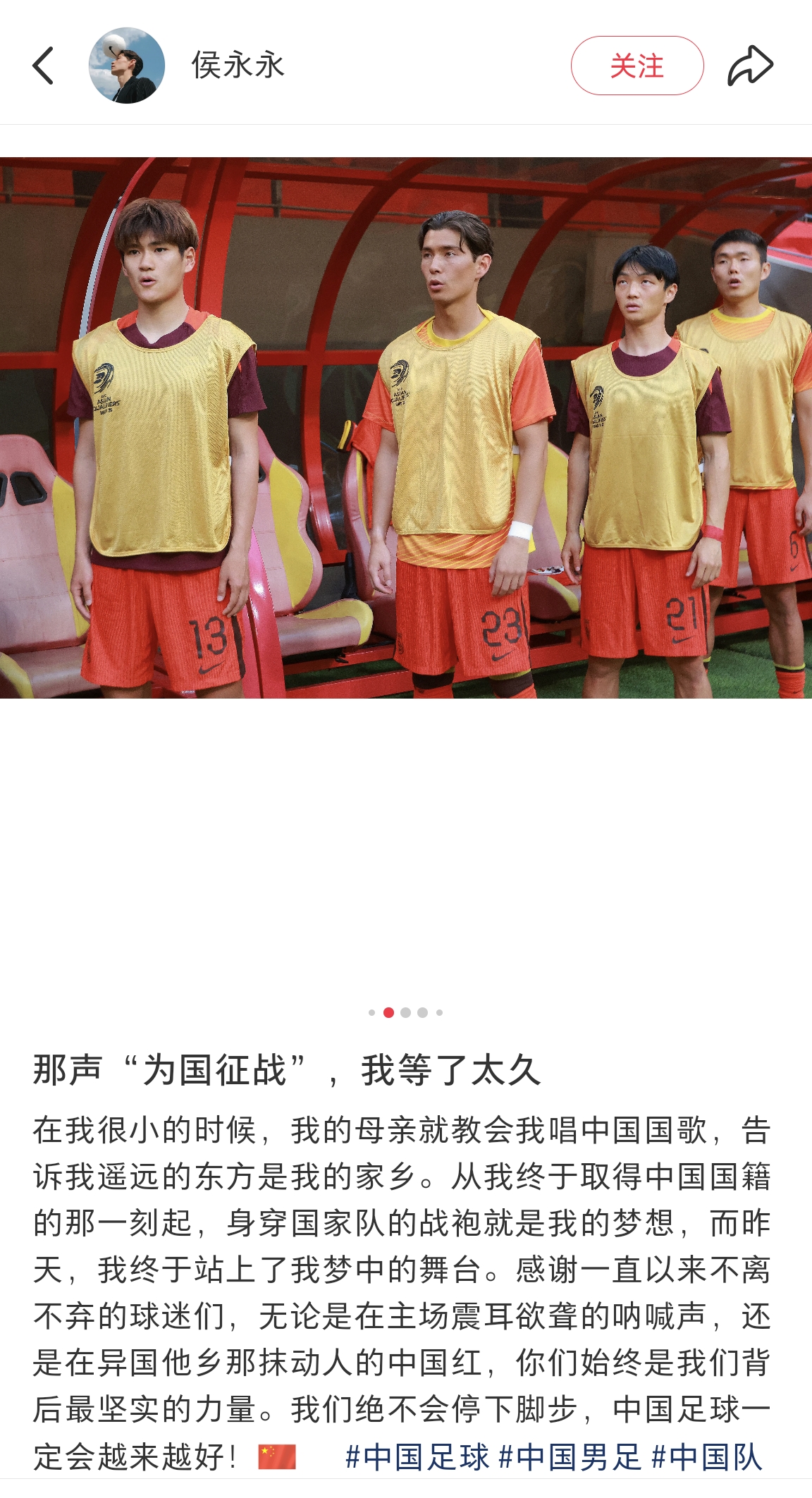 Hou Yongyong updated his social media and posted several photos of himself wearing national football jerseys and training suits, writing: “When I was very young, my mother taught me to sing the Chinese national anthem and told me that the distant East was my hometown. From the moment I finally obtained Chinese nationality, wearing the national team’s jersey was my dream. Yesterday, I finally stood on the stage of my dreams. Thanks to the fans who have always been unfamiliar with me, whether it is the deafening shouting at home or the moving Chinese red in a foreign country, you are always the most solid force behind us. We will never stop, Chinese football will definitely get better and better!”