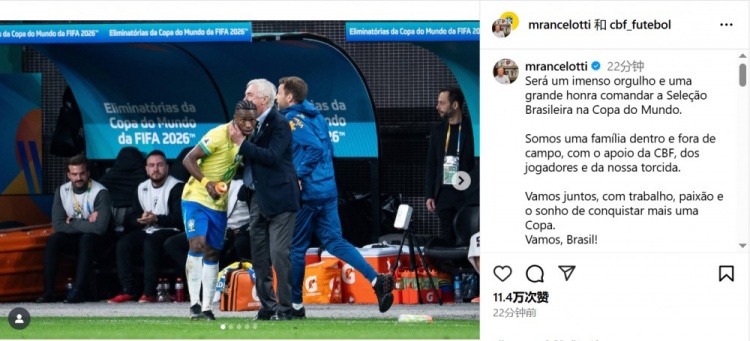 After the game, Brazilian coach Ancelotti posted photos on social media to celebrate the team’s victory. He also wrote: “I am deeply honored and proud to be able to lead the Brazilian national team to the World Cup. Whether on and off the court, we are like a big family, with the support of the Brazilian Football Association, players and fans.”