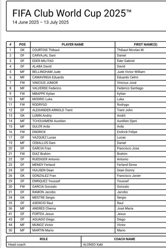 1-Courtois, 2-Carvajal, 3-Militon, 4-Alaba, 5-Berlingham, 6-Camavinga, 7-Vinicius, 8-Valverde, 9-Mbappe, 10-Modric, 11-Rodrigo, 12-Arnold, 13-Lunin, 14-Joan Améni, 15-Gurel, 16-Endrik, 17-Vazquez, 19-Cebalius, 20-Fran Garcia, 21 – Brahimi Dias, 22-Rudiger, 23-Ferran Mendy, 24-Wysen, 26-Fran Gonzalez, 29-Jusoft-Enriques, 30-Gonzalo Garcia, 31-Jacob-Ramon, 34-Mesterre, 35-Raul Asensio, 36-Andres, 41-Fulte, 43-Aguado, 44-Monios, 50-Mario Martin