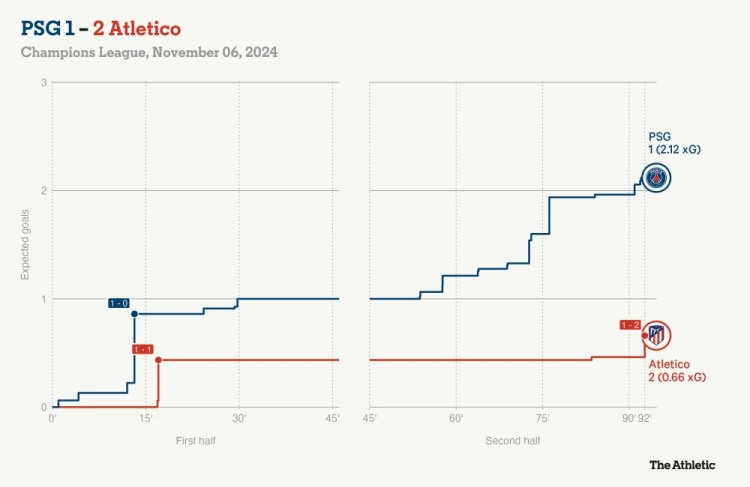 In Atletico Madrid’s 2-1 away defeat to Paris Saint-Germain, the expected number of goals and results of the two teams were completely different