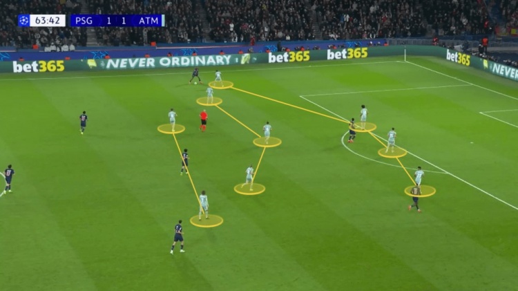 At first glance, the picture above seems to be Atletico Madrid in a defensive position, and Paris Saint-Germain is launching another offensive into the offensive third zone. But that’s not the case – just 10 seconds before this moment, Atletico Madrid completed a continuous pass with a shot. When Paris Saint-Germain tried to use Atletico Madrid’s offensive input to launch a quick counterattack, Atletico Madrid’s tirelessness and determination (and of course, the sense of position) stifled the possibility of Paris Saint-Germain’s easy counterattack.