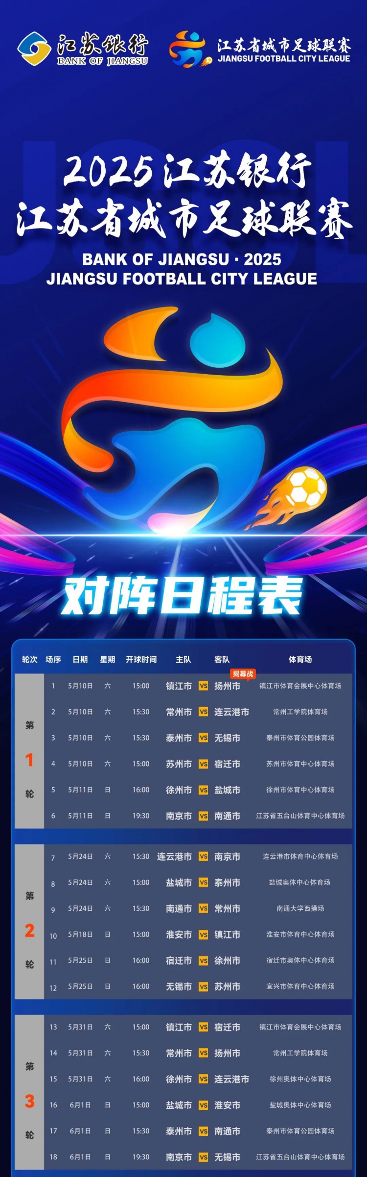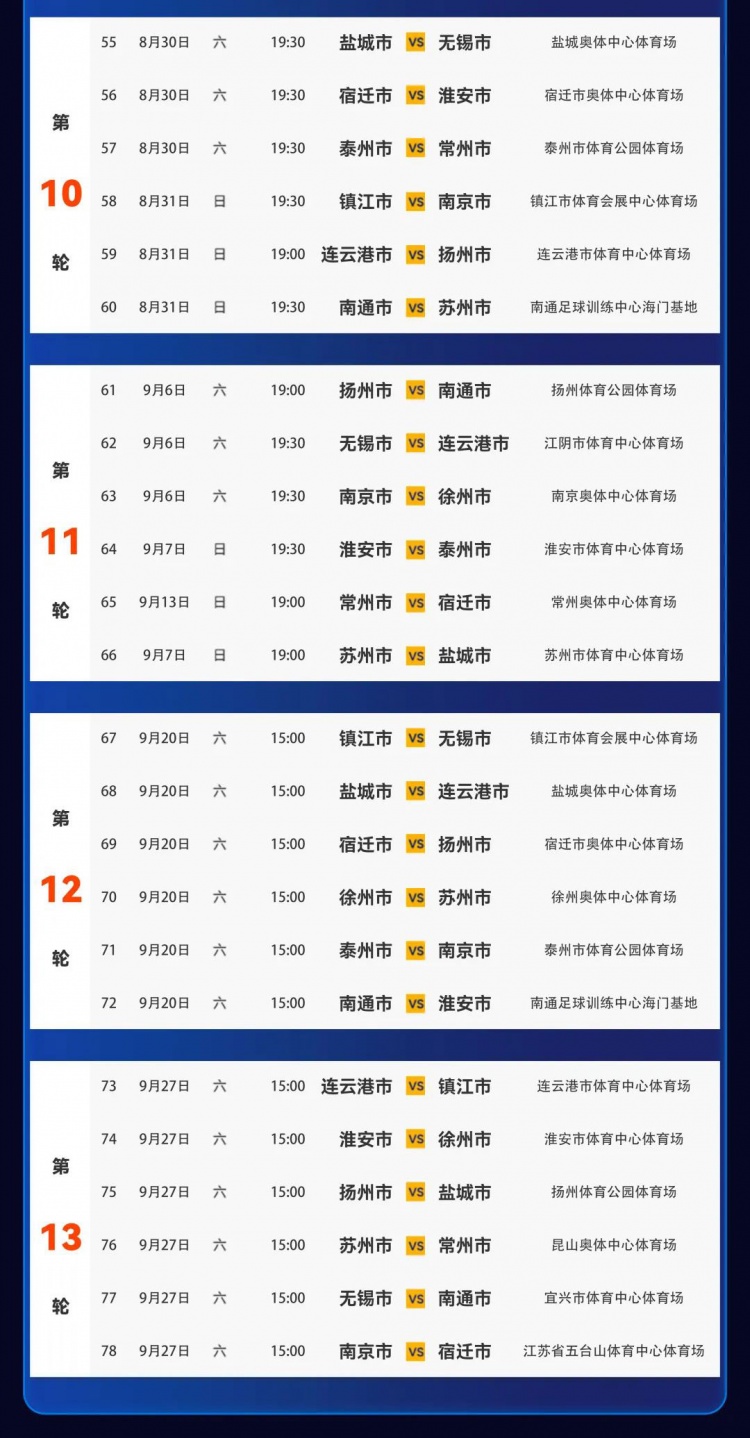 The official announcement of the Jiangsu Provincial Urban Football League stated that in order to properly cope with the adverse effects of summer heat and enhance the fans’ viewing experience, with the application of relevant competition areas and the approval of the team, the organizing committee studied and decided to adjust some of the competition venues and kick-off time.