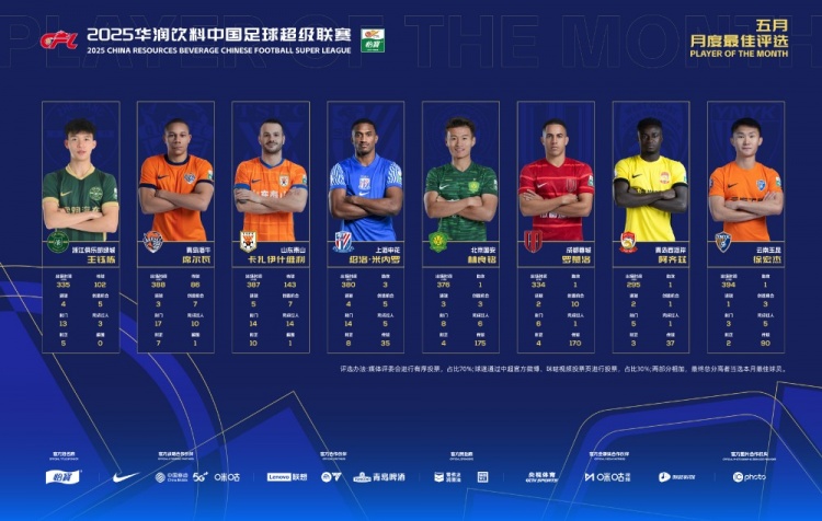 1BSPORTS 1B Sports June 12th The list of the best players in the Chinese Super League in May was announced, and 8 players including Wang Yudong were shortlisted.