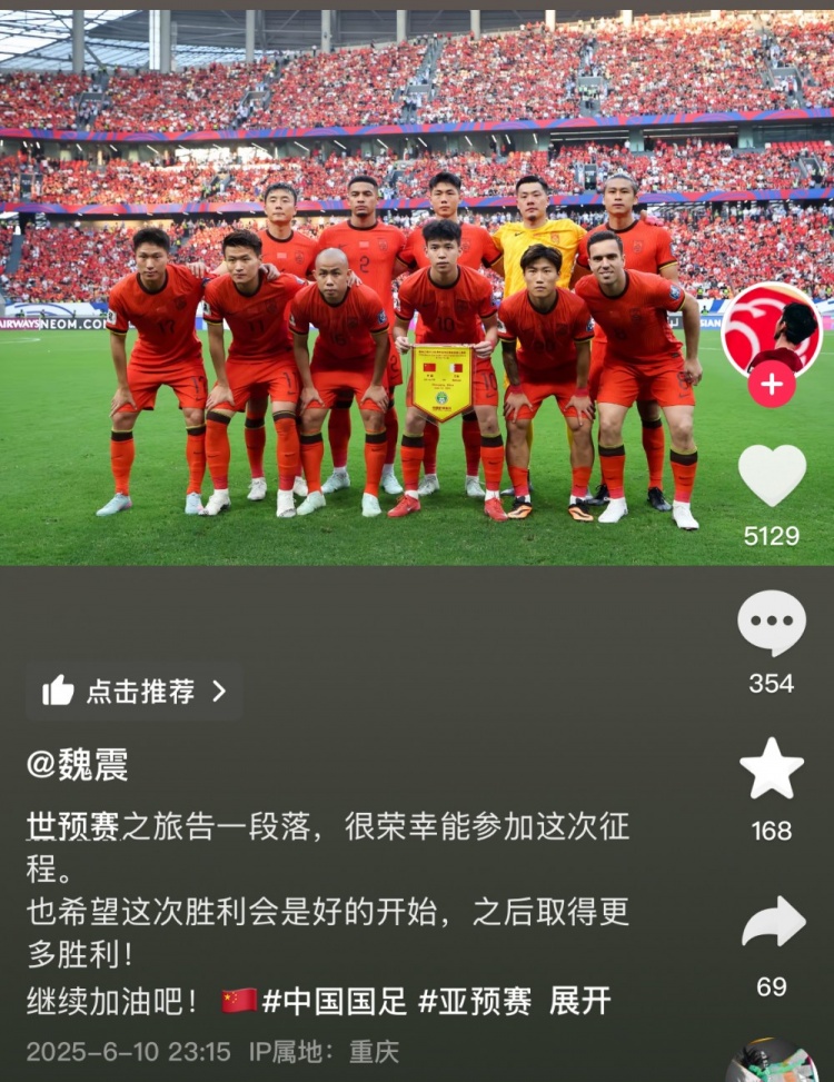 After the game, Wei Zhen updated his social media, posted photos such as before the national football team, and wrote: “The World Cup qualifiers have come to an end. I am honored to be able to participate in this journey. I also hope that this victory will be a good start and more victories will be achieved in the future! Keep cheering!”